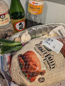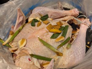 七面鳥は冷蔵庫から取り出し常温にもどす。※たれに使ったネギ、しょうが、にんにくは焦げるので取り出す