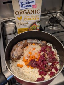 その間にスタッフィングのおこわを調理。お米をとぎ、野菜と内臓は細かく切る。それらを全部鍋に入れ、水のかわりにチキンストックと七面鳥の漬けダレで炊く。毎回目分量でやっているけど、今年は漬けダレをスプーン2杯ほどしか入れなかったら味が薄かったので、もうちょっと入れたい。(ここまで約1時間)