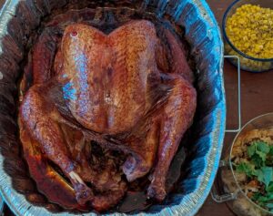表面が焦げないように七面鳥の腹にアルミホイルかぶせる
